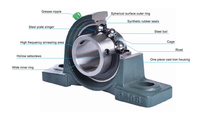 Diese Einheiten sind eine Kombination aus Radialkugellagern, Dichtung und einem Gehäuse aus hochwertigem Gusseisen oder Pressstahl, die in verschiedenen Formen erhältlich sind. Die Außenfläche des passenden Lagers und die Innenfläche des Gehäuses sind kugelförmig, sodass die Einheit selbstausrichtend ist.